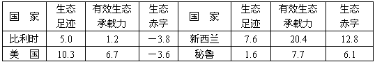 5、单选题 ? 生态足迹是人们所消耗的每种消费品的生物生产面积的总和。有效生态承载力是自然能够对人类提供的生态服务。分析表中的数据,回答1—2题。