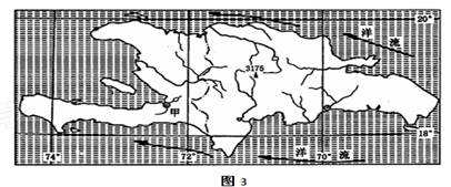 1、单选题 图3表示某岛屿简图,该岛屿中部多山,降水大多在1000mm以上,东北部和西南部降水差异较大,人口密度约400人/平方千米。据此回答7~10题。