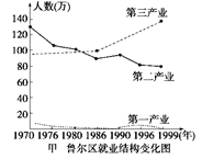 (2)读图甲分析,1970年以来鲁尔区产业结构变化的趋势主要表现为?,简述促使鲁尔区产业结构调整的主要原因。