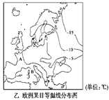 (1)根据图乙中信息判断欧洲此时正处在?季。此时西欧等温线大致与海岸线平行,其主要影响因素是??