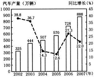2、单选题  据2009年12月4日中央电视台报道,截止到11 月份我国今年累计产销汽车超1200万辆。结合2002~2007年我国汽车产量走势图,回答1~2题。