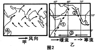 小题1:图形表示北半球夏季、南半球冬季,所以北印度洋吹西南风、海水自西向东流动,故日本油轮从中东返航时顺风顺水。华北平原冬春季节多沙尘暴。北半球的地中海气候区为炎热干燥季节,此时的南半球地中海气候区为温和多雨的季节。美国中央大平原小麦在春末、夏初收获,或者在秋季收获。