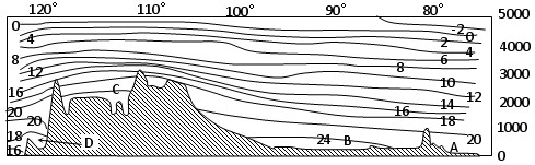 2、图中A、B、C、D四地近地面大气污染物最不容易扩散的是