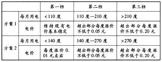 5、单选题 2010年10月9日,国家发改委正式公布了《关于居民生活用电实行阶梯电价的指导意见(征求意见稿)》。此次发改委在征求意见稿件中设计了两套方案。读两套阶梯电价调价方案一览表,从表中可以看出