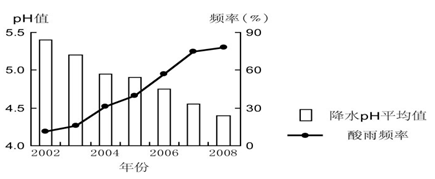 下图示意某特大城市2002~2008年降水pH平均值和酸雨频率,读图回答下列问题。