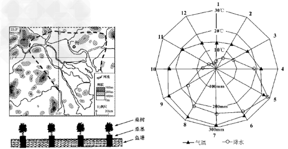 3、综合题 阅读珠江三角洲位置图,桑基鱼塘示意图和气候资料统计图,分析回答问题。