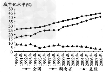 3、单选题  读1990年~2008年湖南省以及全国城市化水平比较图,回答1—2题。?