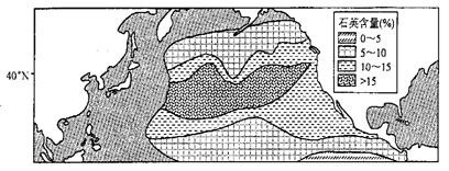 1、单选题 石英是一种稳定物质,广泛存在于岩石、沙土中。深海沉积物中的石英短时期内不会自生自灭。下图示意北太平洋沉积物中石英含量分布。完成小题。