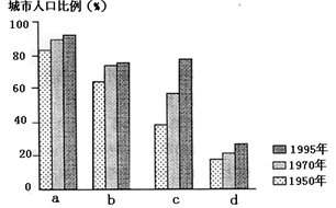本题解析:1.a城市化水平高,且变化不大,为英国;b在1950年后有一定发展,且本身城市化水平比较高,为美国;C城市化水平在二战后迅速发展,为巴西;d城市化水平低且变化不大,为印度。正确答案选B。
