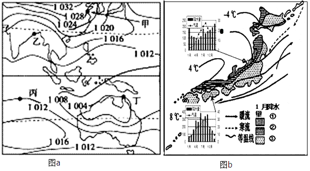 (2)四地中,丙处的等压线最密集,水平气压梯度力最大,风力最大。日本冬季吹东北风,风从西伯利亚吹向日本的过程中途径日本海,带来水汽,经过山地的抬升,形成雨雪。