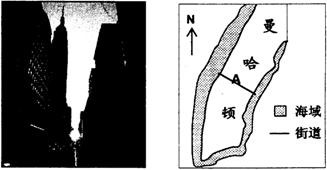 1、单选题  2010年11月10日,美国纽约市曼哈顿区不少街道(与图8中A街道平行)都出现“曼哈顿悬日”美景(日出或日落时,下左图所示),此时太阳在地平线上,且阳光贯穿整条街道.读下图,回答题