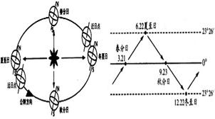 (3)?右图中根据太阳的位置可以判断,1靠近冬至日,2靠近秋分日,3靠近夏至日,4靠近春分日。由以上信息可知此时地球在右图公转轨道上的位置是1—4地中的1地。