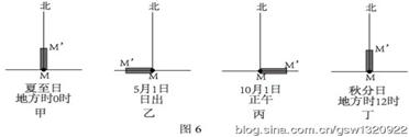 5、单选题 我国某高中学生在某日中午前后,进行地理课的研究性学习活动。他们利用一根标杆,每隔1小时测量一次杆影的长度,并将测量结果绘制成示意图(右图)。据此判断12~13题。