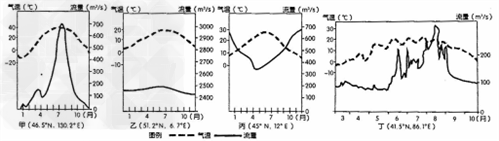3、单选题 读甲、乙、丙、丁四地附近河流流量与气温季节变化示意图。读图回答1-3题。