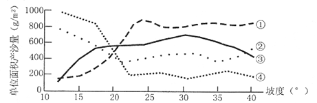 小题3:下图是同学根据调查结果绘制的坡度与单位面积产沙量关系曲线,其中符合水土流失一般规律的是?(?)