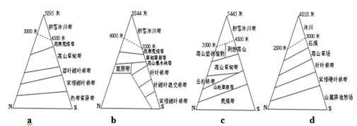 3、单选题 下图关于珠穆朗玛峰、乞力马扎罗山、天山、阿尔卑斯山四座山的雪线和自然带的情况,完成下列小题