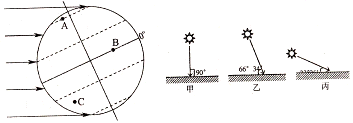 (2)左图表示的节气是________,该日A、B、C三地中白昼最短的是________地,最晚看到日出的是________地。