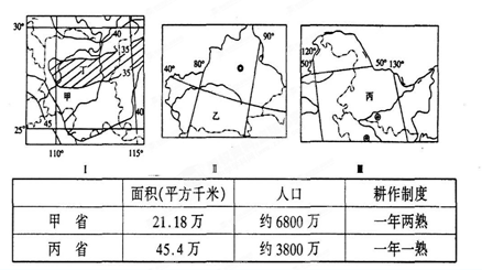 1.若甲、丙两省都种植水稻,分析影响甲、丙两省水稻种植共同的因素分别是2.分析乙、丙两地发展农业生产的限制性因素分别是3.Ⅰ图中数字为“河川夏季平均径流量占年平均径流量百分比”,图中丁地带7、8月份河流流量占全年百分比较小,其主要原因是