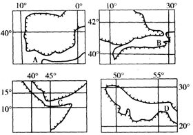 本题解析:本题考查世界地理概括。根据图示的海陆轮廓和经纬度位置判断,A为直布罗陀海峡;B为土耳其海峡;C为曼德海峡;D为霍尔木兹海峡。