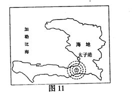 3、综合题 如图,加勒比海岛国海当地时间2010年1月12日下午4点53分发生里氏7.3级强烈地震,震源浓度约10公里,震中离海地首都太子港只有15公里。海地位于两大板块的消亡边界上,地震是由于板块相互挤压引起的。这次地震受灾人数达300万人,造成严重的人员和财产损失。据此回答: