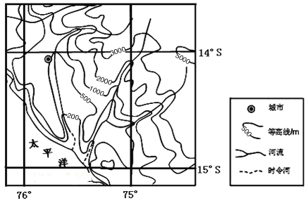 【小题1】根据图中经纬网信息可知,该地位于南半球秘鲁沿岸地区,其位于东南信风的背风坡,同时沿岸有秘鲁寒流经过,降温减湿,所以气候干旱,降水较少,故C正确。