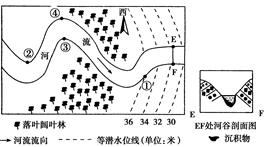 2、单选题 图甲为大陆东岸某河段示意图,图乙为图甲EF处河床横断面图。读图回答题