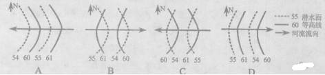 小题2:由上题分析知该地位于北半球;该河流流经温带地区,且由较低纬流向较高纬度,故可能会发生凌汛;该河段位于温带季风气候区,降水的季节变化大,故该河流全年流量变化大;地下水由高潜水位流向低潜水位,且垂直于等潜水位线,故图中地下水的流向背离河流,河水补给地下水。