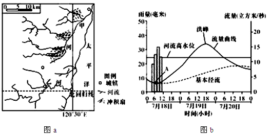 2、综合题 图a是某地区水系分布图,图b是甲河流域某一水文站在某年7月18 日至20日的水文曲线图,而且该测站上游地区的生态环境趋于好转。读图,回答下列问题。(25分)