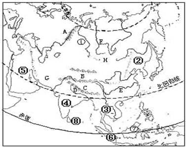 2、综合题  读下面的“亚洲地区图”,回答问题。(20分)