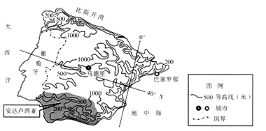 材料一?西班牙是世界橄榄油第一大生产国。图中阴影部分为安达卢西亚,是该国油橄榄的最大种植区,其产量高,品质好。油橄榄喜光,喜温暖,适合生长在排水良好的坡地。