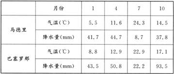 (2)读材料二,说出马德里的气候特点与巴塞罗那相比有何不同?并分析其原因。(8分)