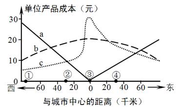 1、单选题 下图为“某工业部门在某城市及其附近地区的土地、运输和劳动力成本曲线图”。其中土地成本和运费都只与距城市中心的远近、交通通达度有关。读图完成下列问题。