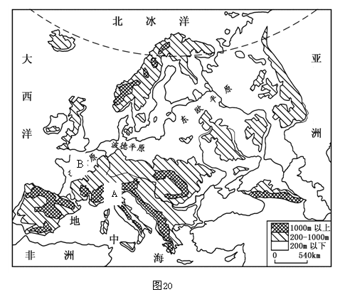 (1)描述图20中欧洲主要地形特征。(2 分)