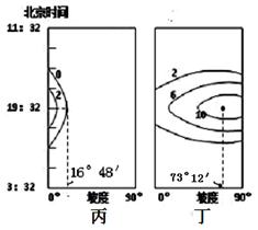 材料一?冬至日北半球甲乙丙丁四地,不同时刻不同坡度所接受到的的太阳辐射(0.1卡/平方厘米·分钟)的变化图。