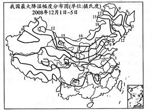 (1)观察图中降温幅度大于15℃的区域。说明该区域降温幅度大的主要原因。(2分)