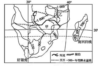 【小题2】赤道穿过非洲大陆的中部,大部分位于南北回归线之间,形成了以赤道为中心南北对称的气候特点。主要的气候类型有:热带雨林气候、热带沙漠气候、热带草原气候和地中海气候。甲地受副高和赤道低气压带交替控制,形成热带草原气候,所以本题D正确。