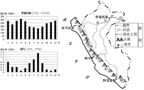 (1)读图,伊基托斯因受赤道低压带控制,盛行上升气流,年降水总量大。利马因安第斯山脉阻挡,地处东南信风的背风坡,且近岸有寒流流经,对沿岸气候起到降温减湿的作用,因此年降水总量小。