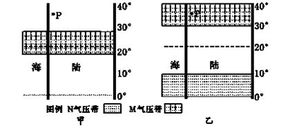 小题2:甲图中N气压带为副热带高气压带,因其位置位于30°N以南地区,向南移动,所以表示1月份,为冬季;乙图赤道低气压带和副热带高气压带均向北移动,所以标示7月份,为夏季。故选B。