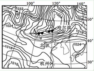 (3)A天气系统向 方向移动,锋面过境后,北京的天气变化是气温 ,气压 ,阴晴变化为 。