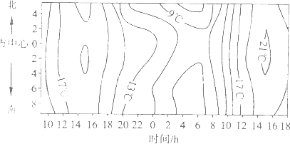 3、单选题 自某城市市中心向南、向北分别设若干站点,监测城市气温的时空分布。监测时间为8日(多云)9时到9日9(晴)18时。监测结果如图所示。据此完成: