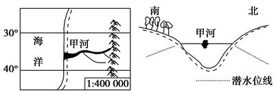 【小题1】读图,根据右图的水位状况,可以判断此时河流水位高于潜水位,河水补给潜水。此时河流所在区域斡旋汛期,根据左图可以判断,此河位于南半球的地中海式气候区。地中海气候冬季温和多雨,所以此时南半球进冬季,北半球是夏季。该河目前受南半球的西风带控制,应吹西北风,A对、B错。受副热带高压控制时,降水少,河流水量小,C错。由前面分析已知,是河水补给潜水,D错。