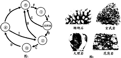2、从成因上对图B岩石分类,与图A中序号对应正确的是
