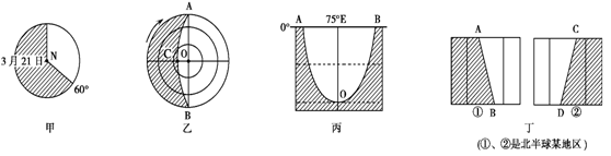 3、综合题 比较下面四幅图(注:乙、丙、丁三图中,阴影区为黑夜),回答问题。(15分)