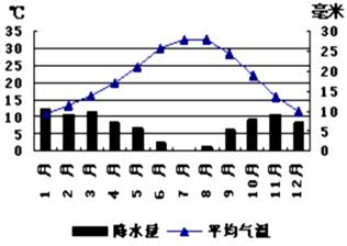 2、综合题 (13分)古代阿拉伯人把今突尼斯、阿尔及利亚和摩洛哥所在地区统称为马格里布地区。下面上图为马格里布地区示意图,下图为该地区瓦德市的气候统计图,下表为上图中①、②两城市各月平均日照时数表(单位:小时)。完成下列问题。