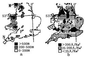 2、单选题 该图为某国部分地区的地形(a)和人口密度(b)。读图,完成问题。