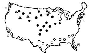 三种符号分别代表美国三种农作物的分布,这三种图例对应的农作物依次是