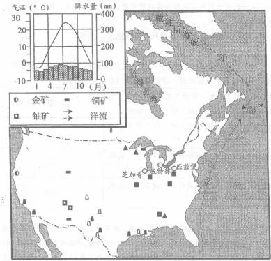 (3)据图中信息,洋流①、②、③中,属典型风海流的是?,其名称是?;图中的气温降水柱状图是芝加哥市的气候资料,根据气温、降水的特点,判断其类型是?,该气候对应的自然带是?(8分)