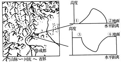 3、单选题 地理研究性学习小组野外考查并绘制了某地地貌景观图(图1)及地形剖面图(图2),读图回答1~2题。