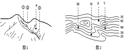 2.图1中的P正处在东部山顶的正南面,山谷的东面,由此可以看出图1中的P地对 应图2中的Y处相对应