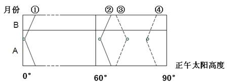 1.根据4-8月①地太阳高度角较小,则①地纬度较高,在a月正午太阳高度达最小值,4-8月太阳直射点位于北半球,6月22日南半球高纬度正午太阳高度达一年中的最小值,根据a月早于b月,所以a为6月,b为7月,①位于南半球较高纬度; 6-7月太阳直射点先向北移动后向南移动,③地太阳高度先增大后减小,所以③地位于北回归线以北地区;②地6月22日正午太阳高度约为60°,且为较小值,则②地位于北回归线以南地区,纬度约为6°34′S;④地6月22日太阳高度约为80°,且为较小值,则④地位于北回归线以南地区,纬度约为13°26′N;所以四地位于最南方的是①,其次为②,位于最北方的为③。所以本题选择B选项。